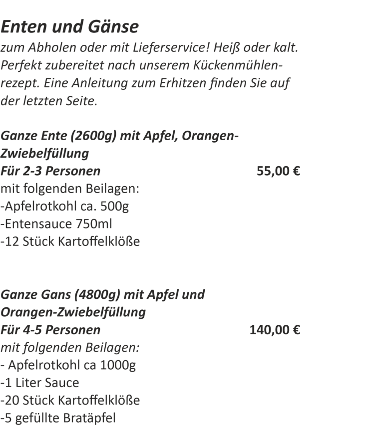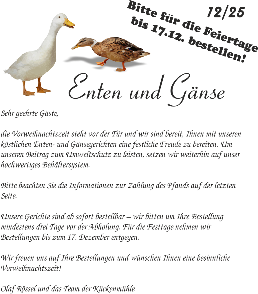 Liebe Gäste, willkommeninderKückenmühle–Ihrem gemütlichenRückzugsortfürgenussvolle MomenteundkulinarischeEntdeckungen! InunseremcharmantenRestaurant erwartetSieeinewechselnde*Preferiti*Karte,dieetwamonatlichmitsaisonalen Highlightsundliebevollzusammenge-stelltenGerichtenbegeistert.Dazuservie-renwirIhneneineerleseneAuswahlan Weinen,dieperfektaufdieAromenunserer Speisenabgestimmtsind.Nebenden saisonalenKreationenbietenwirIhnen aucheineVielfaltanfrischenBowls,die gesundundgeschmackvollsind,sowie unsereköstlichen*Borsa*–italienische Taschen,liebevollgefülltmitGemüseund Fleisch.LassenSiesichverwöhnenund genießenSieunvergesslicheStundeninder Kückenmühle!Egal wie, wir freuen uns auf Sie!Olaf RösselP.S: unser Weihnachtsmenü finden Sie hier